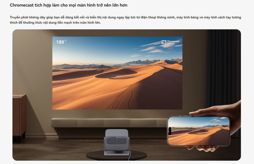 Hỗ trợ nhiều cổng kết nối như HDMI, USB và AUX 3.5mm, máy chiếu Wanbo Vali 1 đáp ứng nhu cầu ghép nối với đa dạng loại thiết bị. WiFi băng tần kép 2.4/5GHz đảm bảo kết nối mạng ổn định, mượt mà khi truy cập các ứng dụng trực tuyến. Tính năng Chromecast tích hợp cho phép truyền nội dung không dây từ điện thoại hoặc laptop một cách dễ dàng.